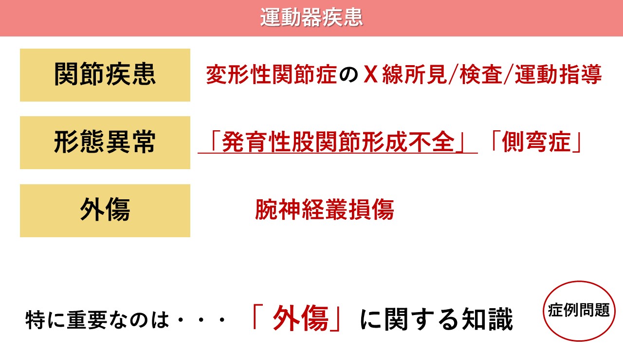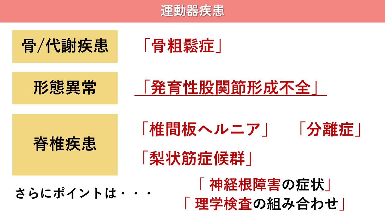 臨床医学各論でよくでる分野は「運動器疾患」「消化器疾患」「神経・筋疾患」などです。